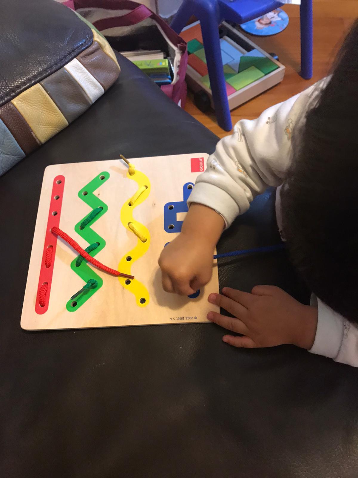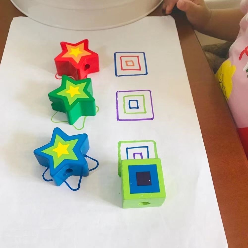 當熟練穿珠後可以增加難度💪,挑戰Lacing前後縫紉不同線狀➰、物件形狀等🔷🔺。大概2歲左右BB可以先玩光影輪廓影子遊戲🔘,或在沙盤用手指畫👆再lacing,增強認知能力👍!