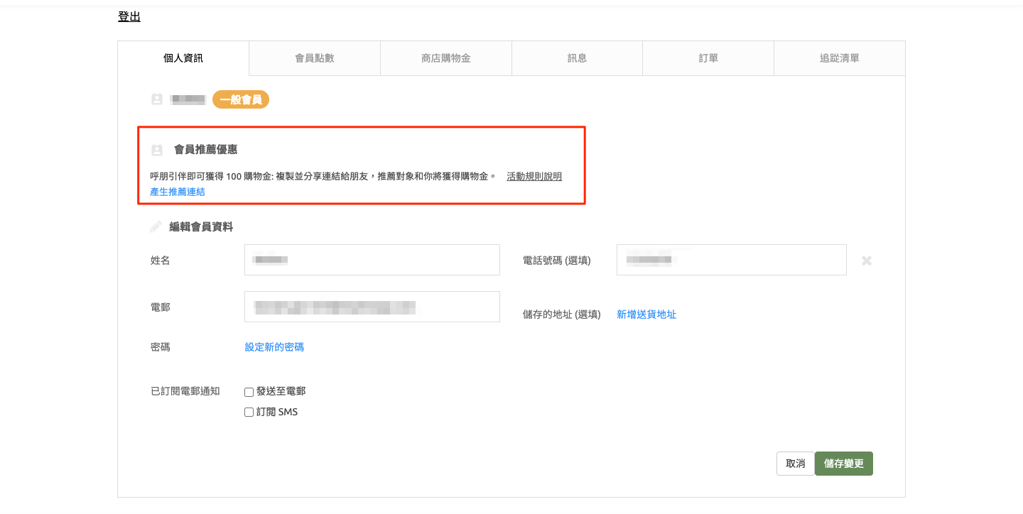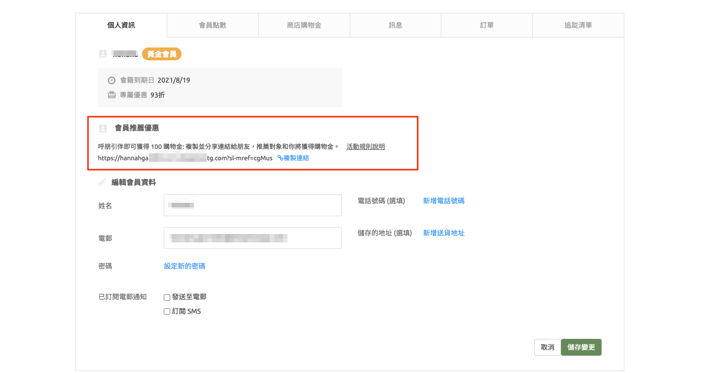 前往商店前台「會員中心」>「個人資訊」,找到「會員推薦優惠」區塊,點擊「複製連結」,即可成功複製會員推薦連結