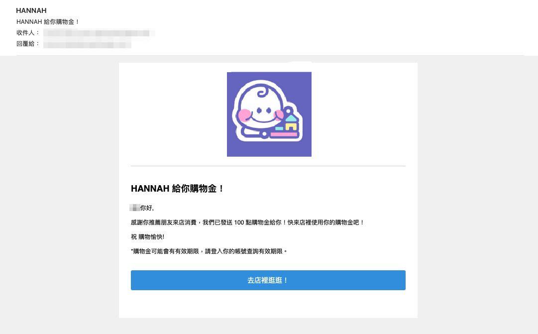 將連結分享給朋友,待朋友成功註冊且第一筆訂單狀態更改為「已完成」,該會員(推薦人)即可獲得購物金。而系統在購物金成功發送給推薦人後,會寄送信件通知,如下圖所示。