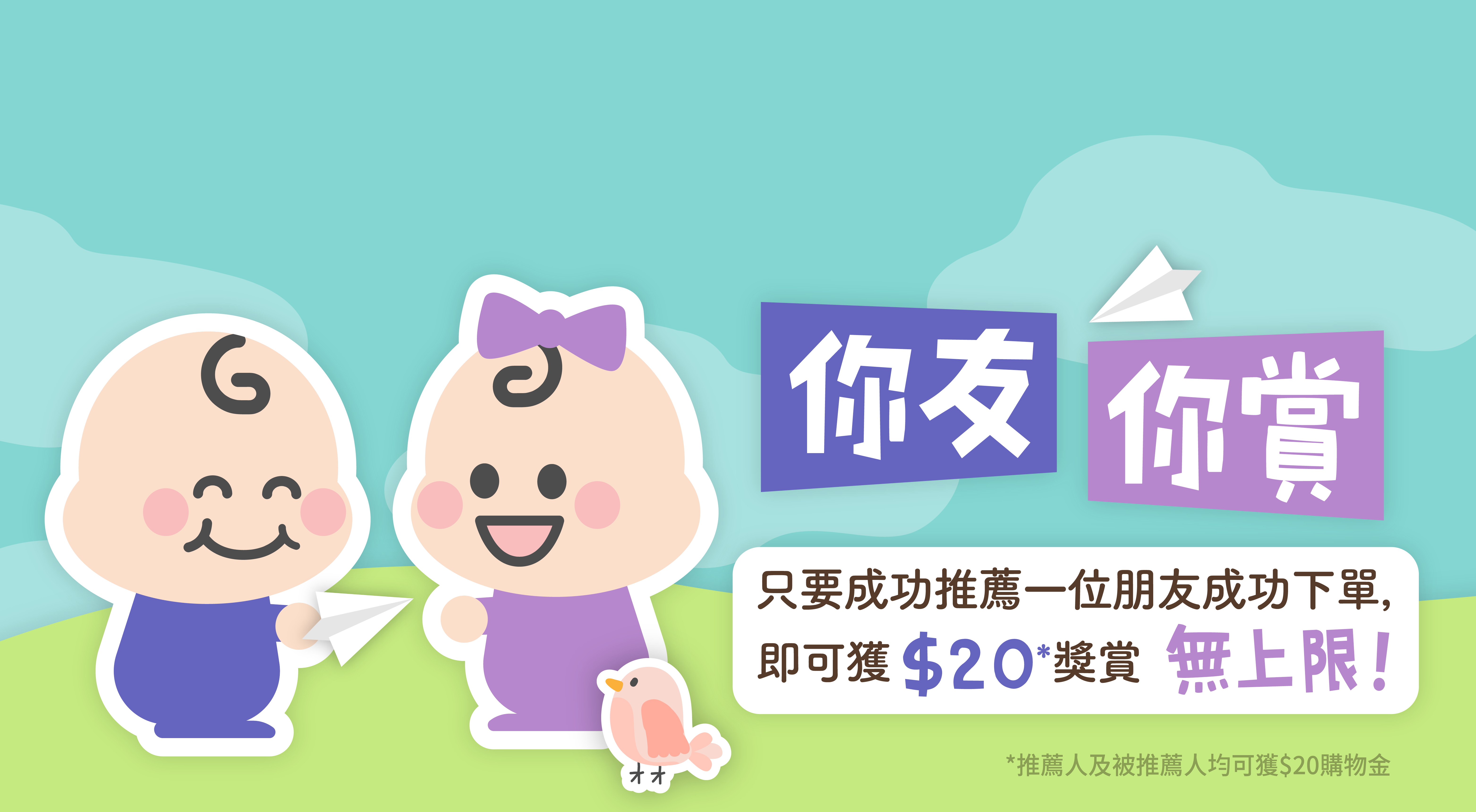 分享你專屬連結給媽媽朋友們,當她們利用連結註冊為新會員且第一筆訂單已轉為「已完成」狀態後,你和你朋友都將會獲得$20購物金