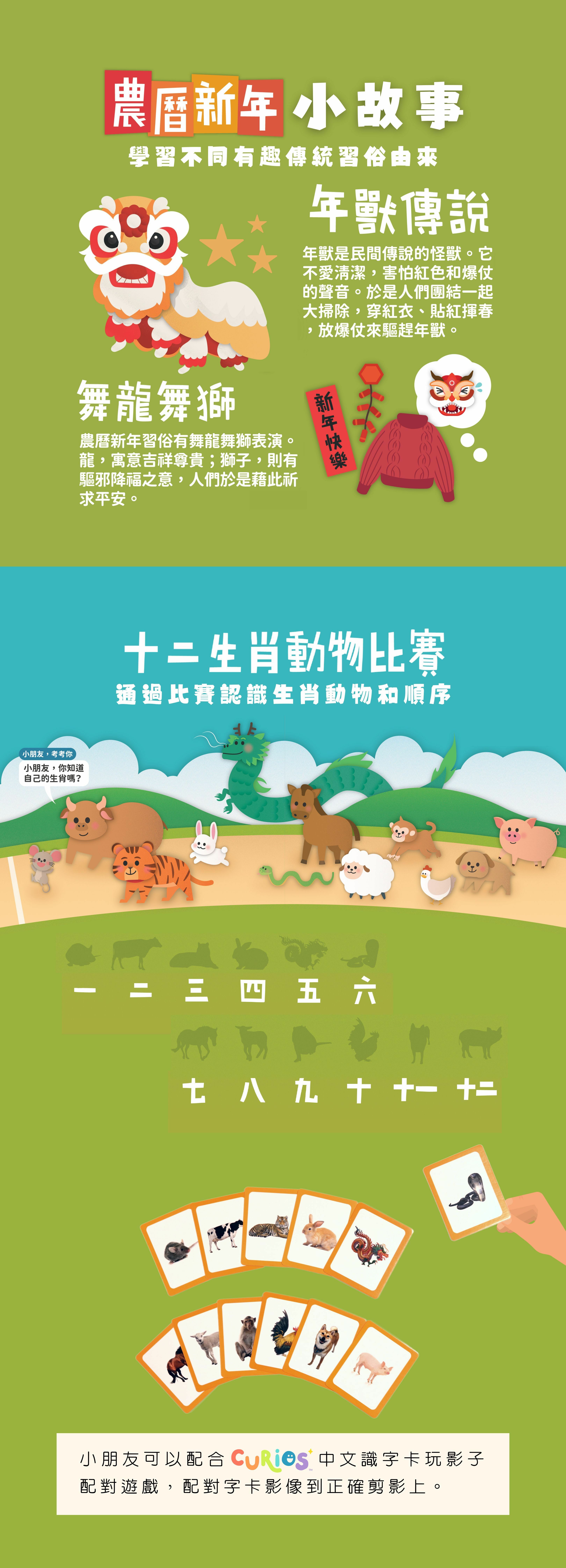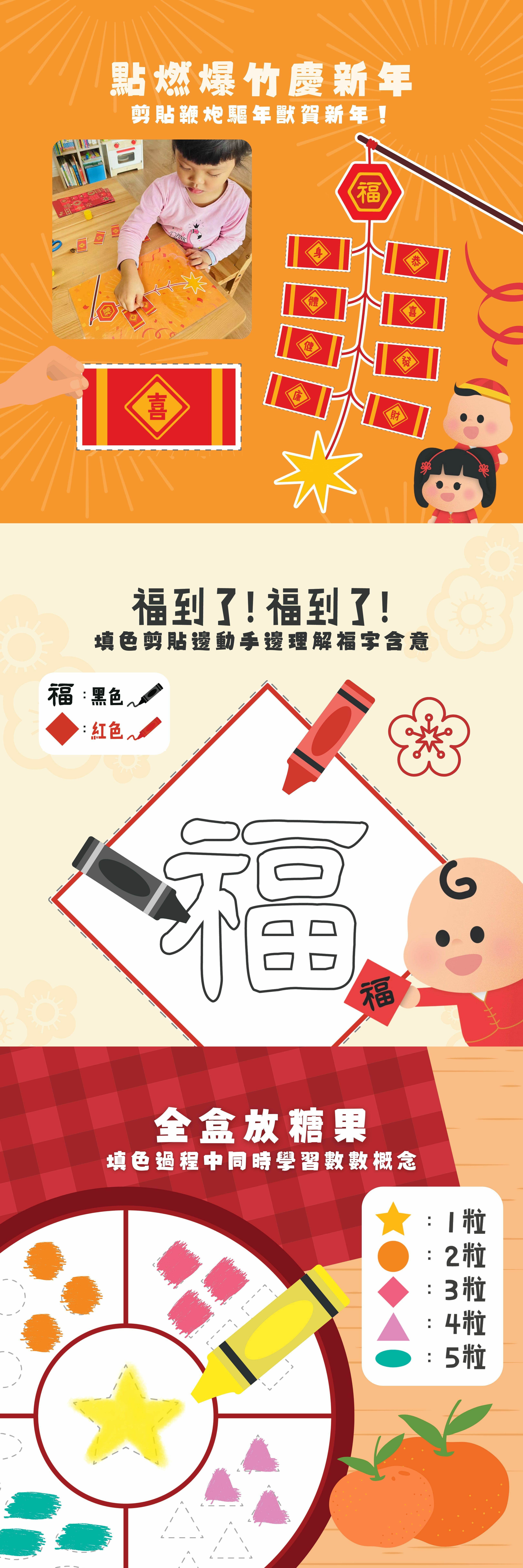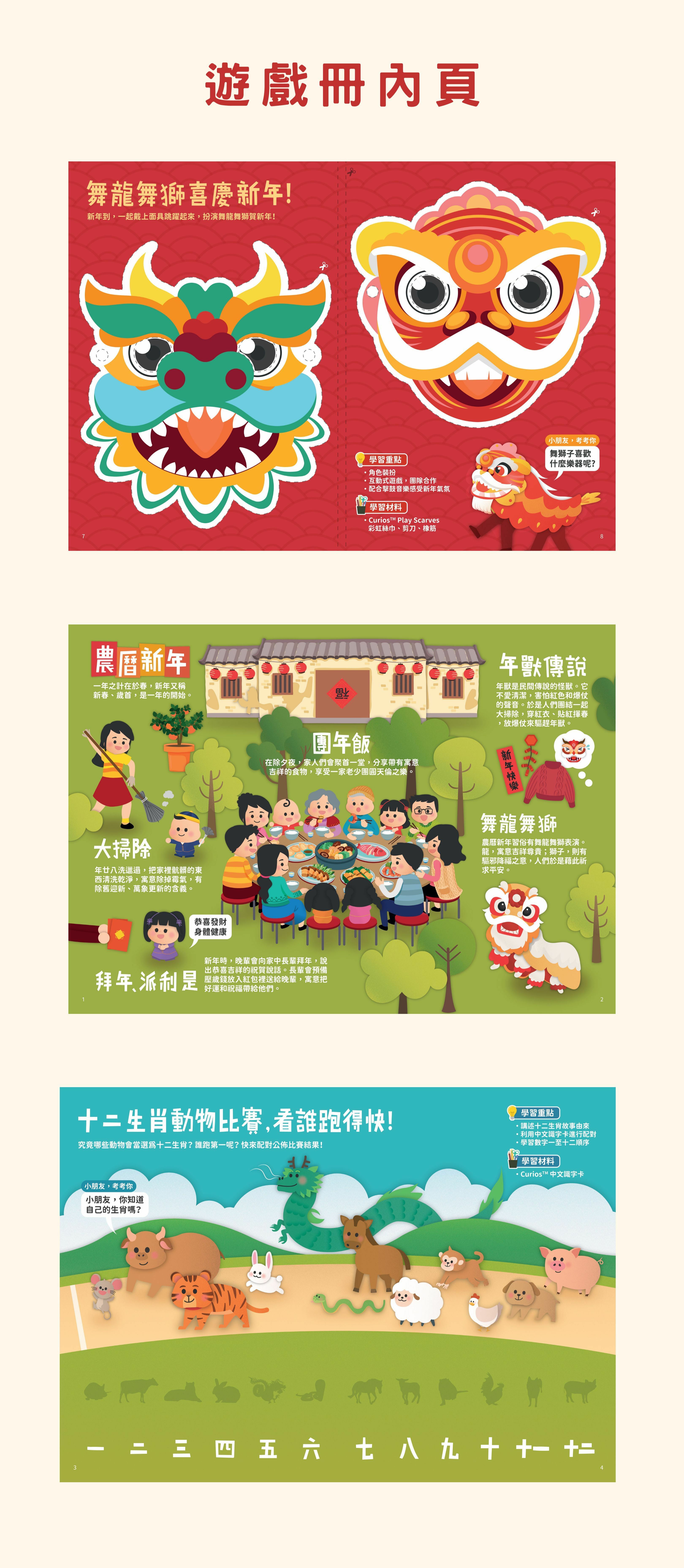 🐲6大新年主題包括新年小故事、舞龍舞獅、十二生肖、點燃爆竹、福子揮春、全盒糖果等