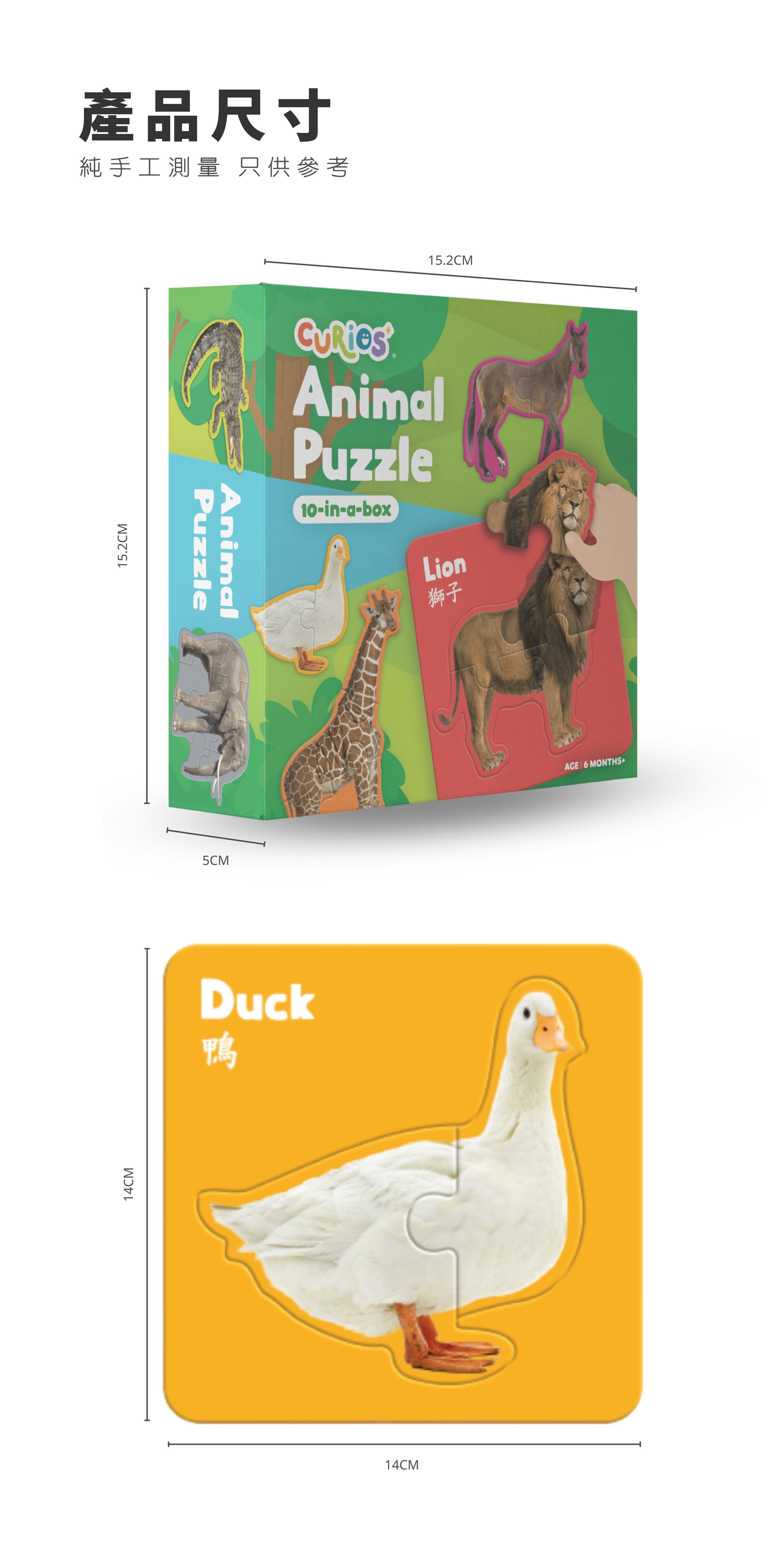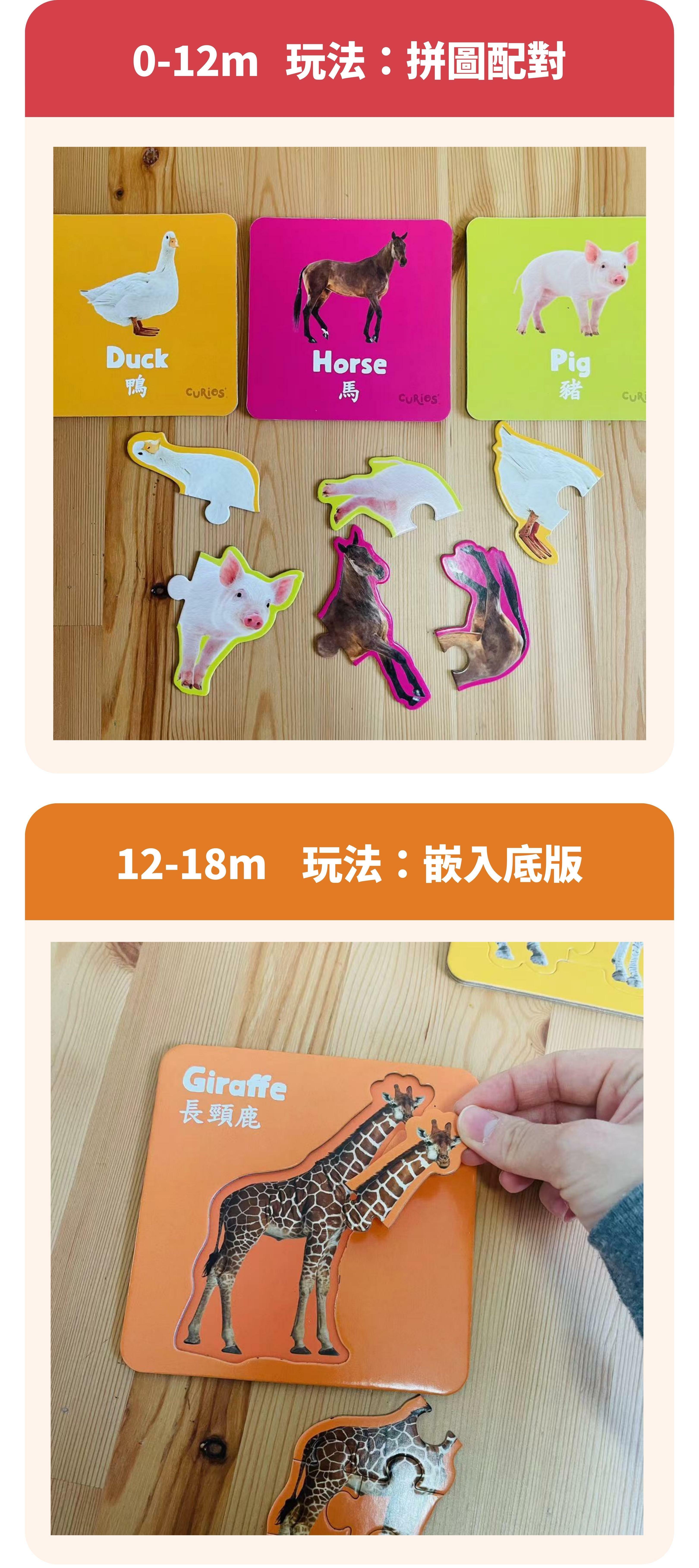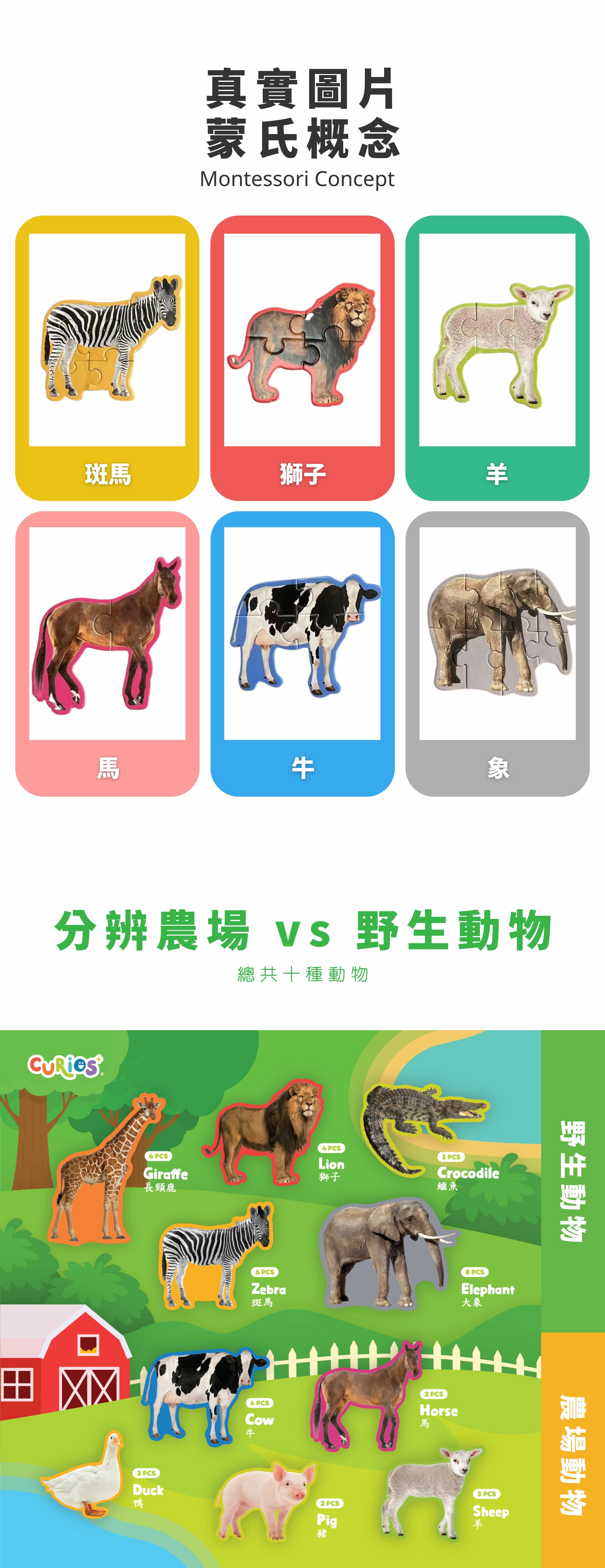 CuriosⓇ 動物幼兒拼圖一盒拼圖有🔟種動物,一次過學曬野生同埋農場動物🦒🐄!每一種拼圖既切割片數塊唔同🧩,由2️⃣塊到8️⃣塊,難度循序漸進,陪伴住BB從0歲學習到3歲📈!