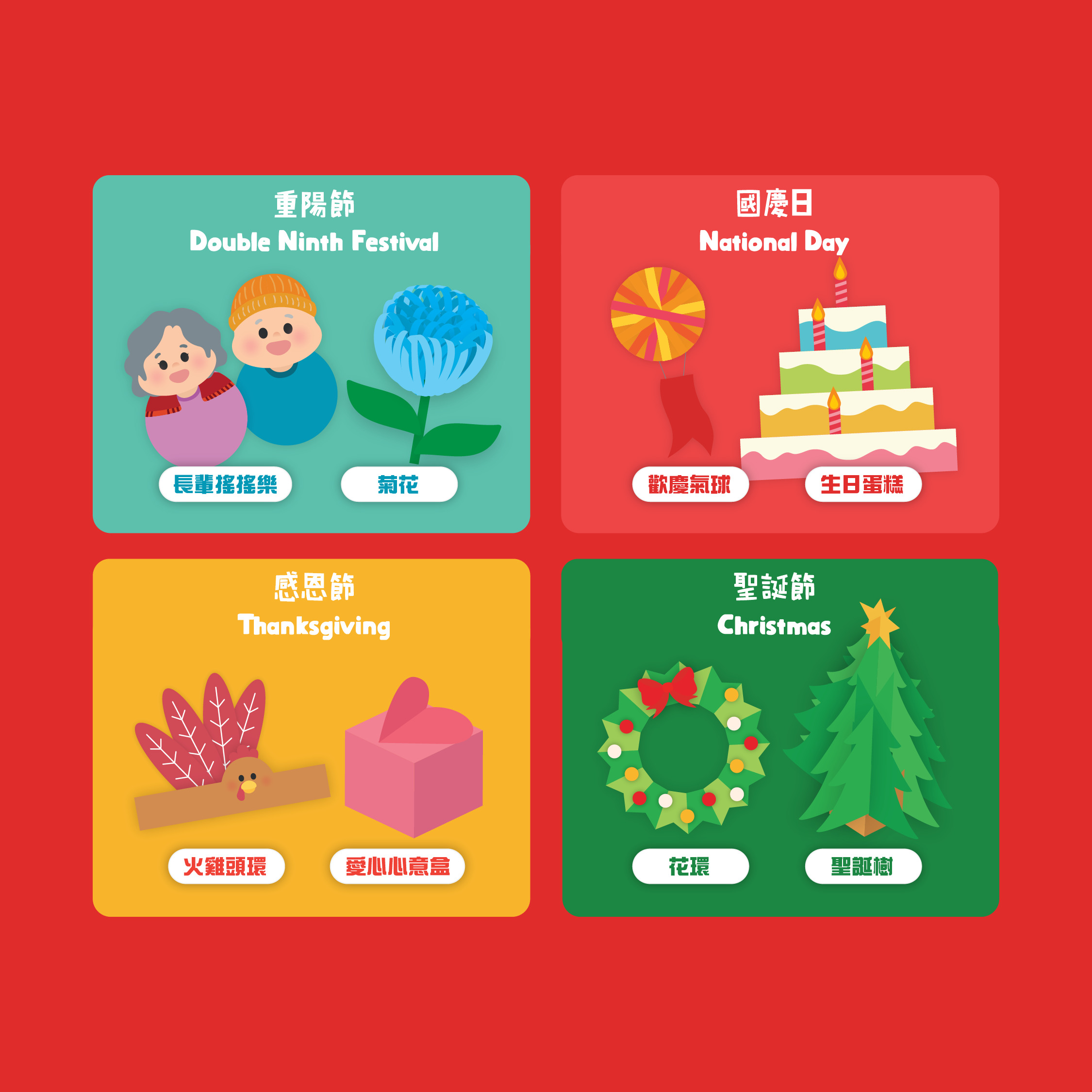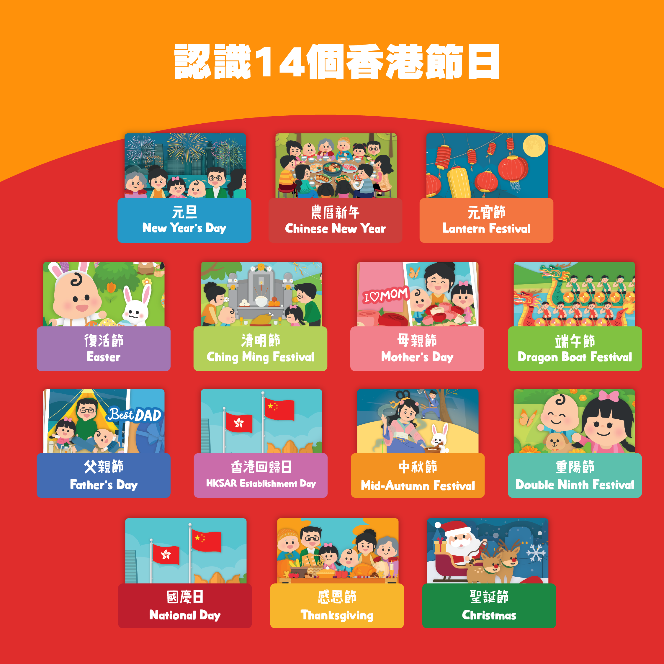 🌈節日包括:元旦、農曆新年、元宵節、復活節、清明節、母親節、端午節、父親節、香港回歸日、中秋節🎑、重陽節、國慶日、感恩節、聖誕節🎄