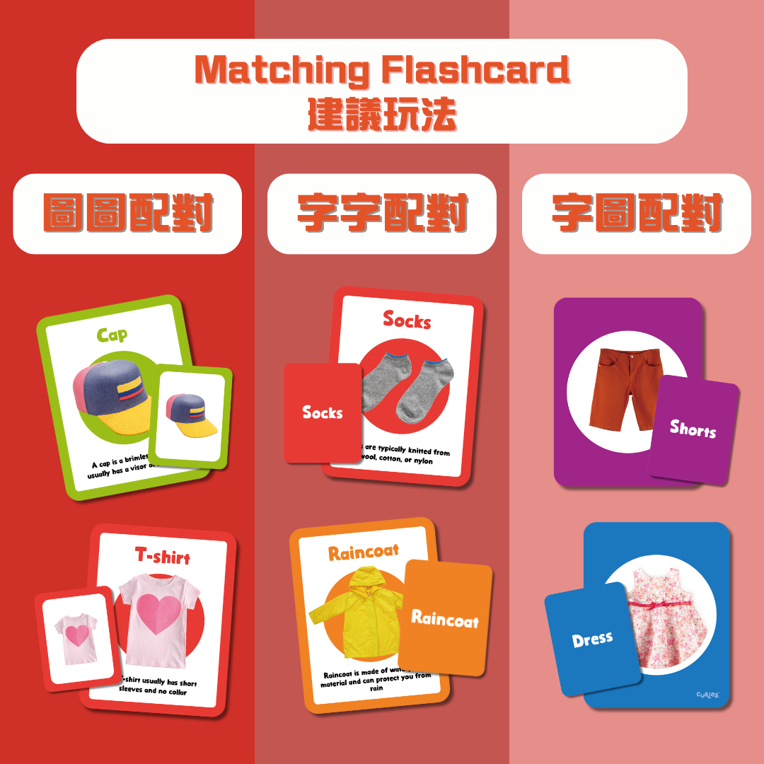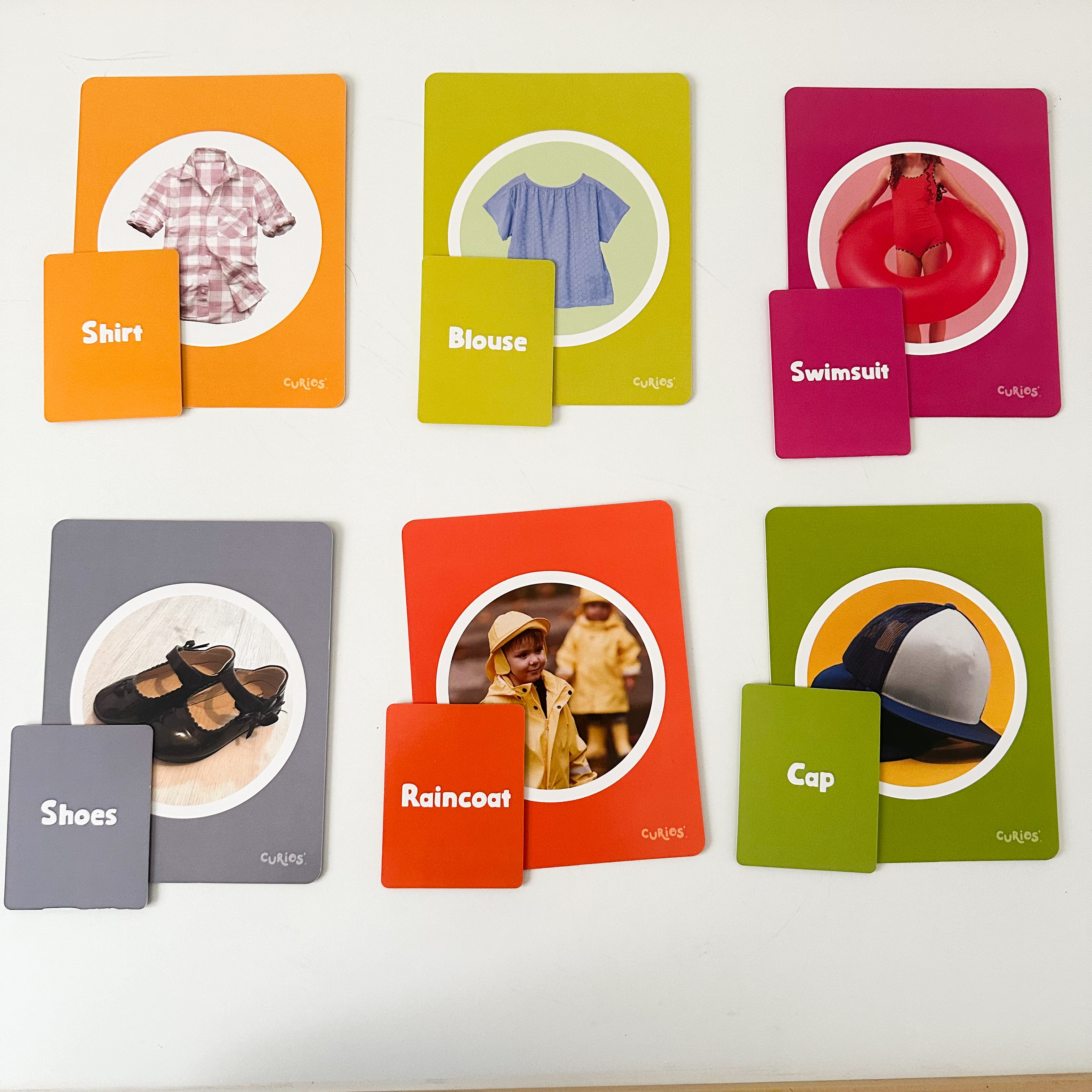 Curios® 英文衣物配對卡包含日常經常會著到嘅25款衣物🩴🧥👗🧦🧢