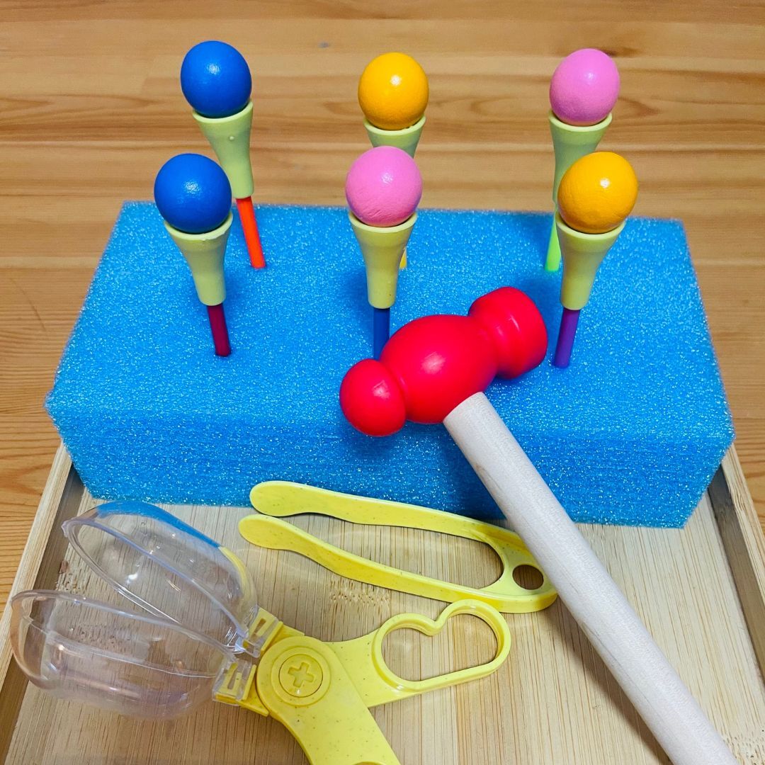 🧰16件工具:黃色小夾、波波鉸剪夾、小圓木球、幼兒鎚仔、彩虹golf tee、珍珠揼揼板